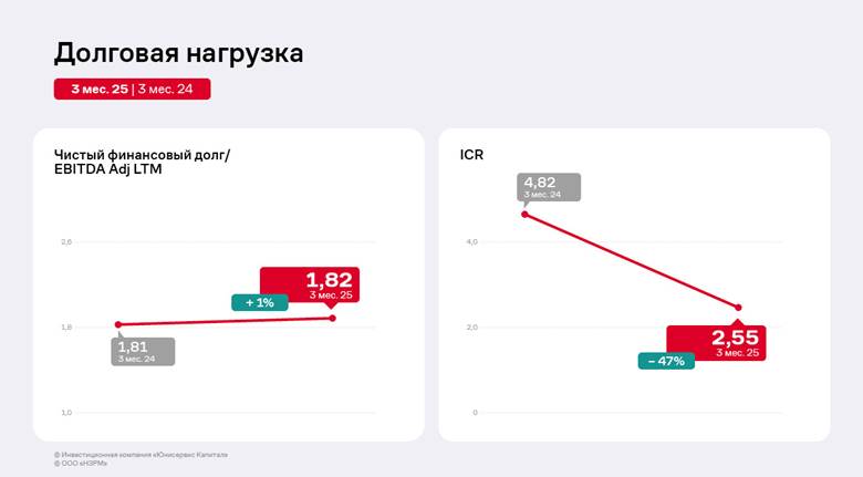 Также можно отметить грамотную долговую политику эмитента. В 2024 году «НЗРМ» приступил к выплате частичных досрочных погашений номинальной стоимости облигаций выпуска НЗРМ-БО-01, размещённого в 2022 году. В 2024 г. сумма амортизационных выплат составила 24 млн руб., а в 1 квартале 2025 г. — 12 млн руб.